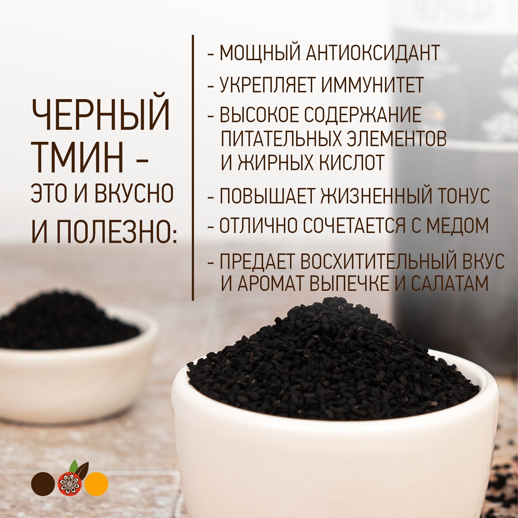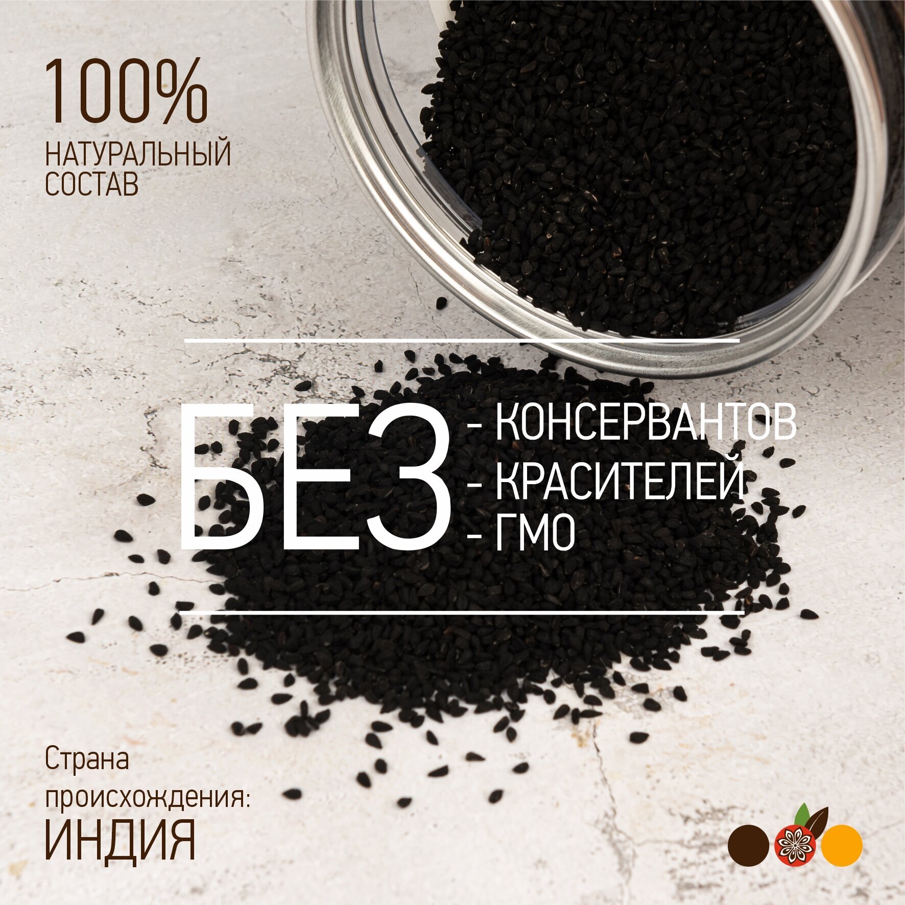 Семена черного тмина (Nigella Sativa) ​индийского сорта. Содержат огромное количество полезных веществ, среди которых витамины группы B, витамин Е, минералы, полиненасыщенные жирные кислоты, антиоксиданты и множество других.